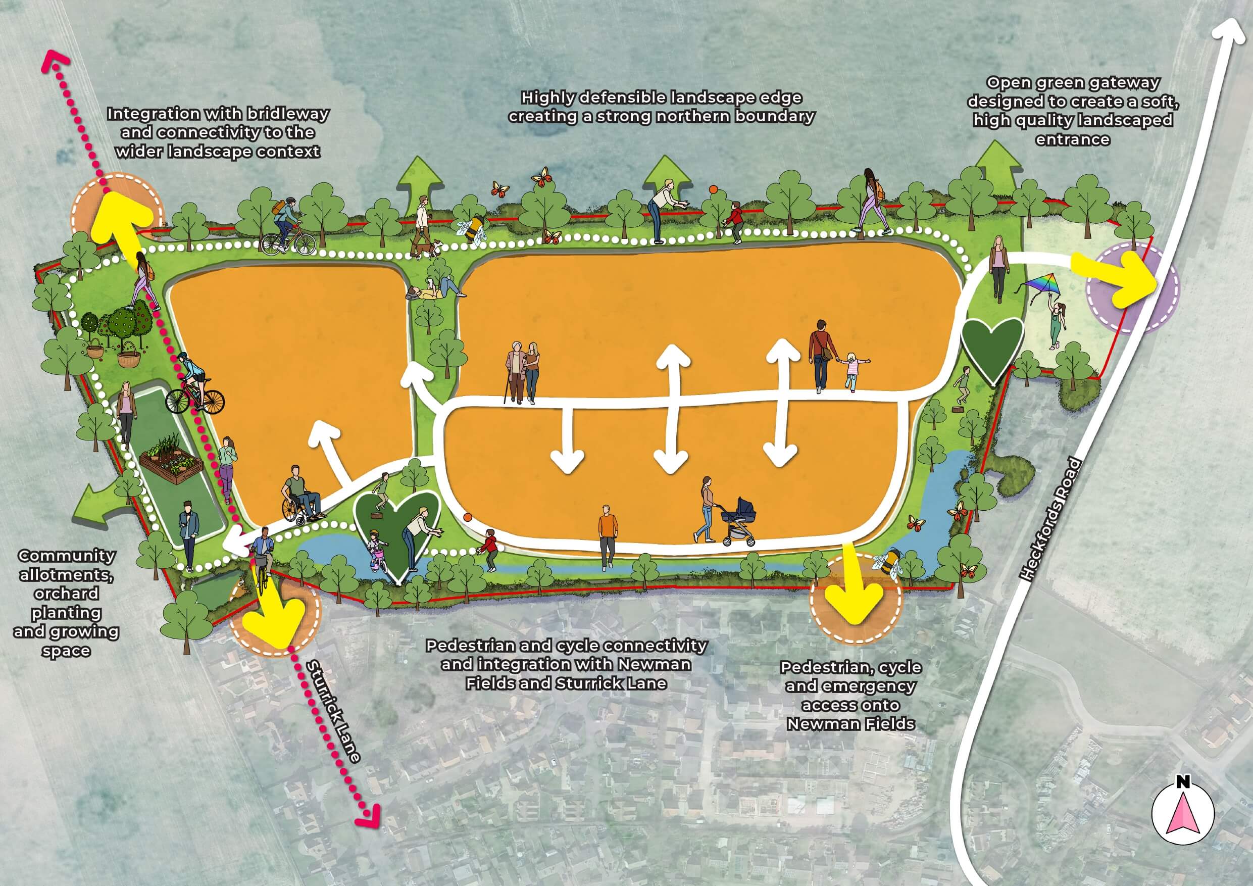 New multi-functional green open spaces, enhanced existing green infrastructure and boundary planting to strengthen the existing landscape structure;